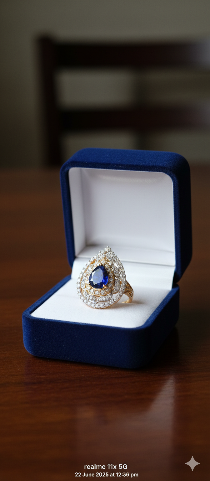 Elegance meets bold style in this floral designer ring, featuring a striking blue teardrop-shaped center stone surrounded by intricate layers of shimmering white stones. The design mimics a blooming flower, symbolizing grace and timeless beauty. Crafted with attention to detail, the dual-tone finish (gold and silver) adds depth and richness to its luxurious appearance.