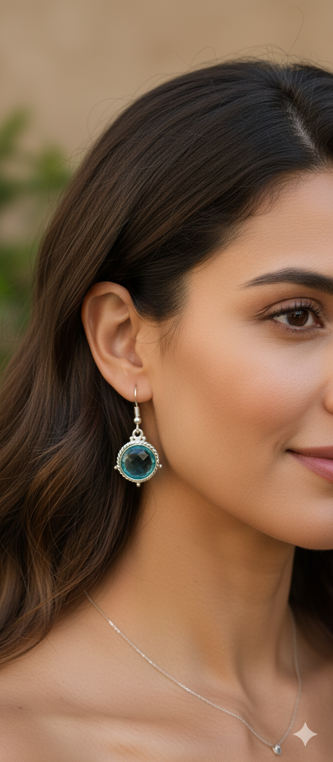 • Design: Sophisticated round-cut blue gemstone set in a detailed, silver-plated rope-style bezel for a timeless, designer look.